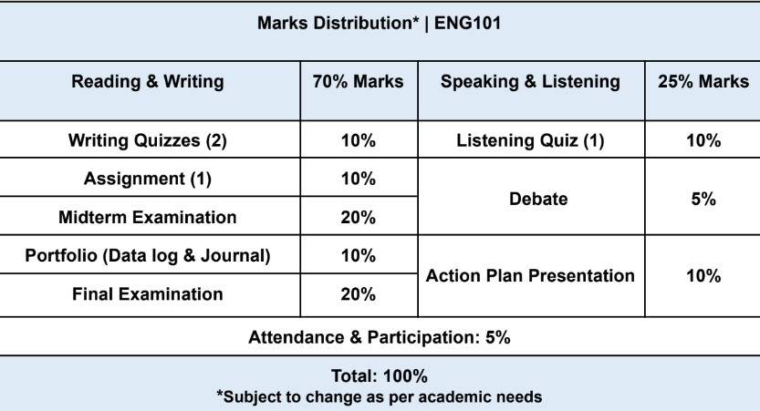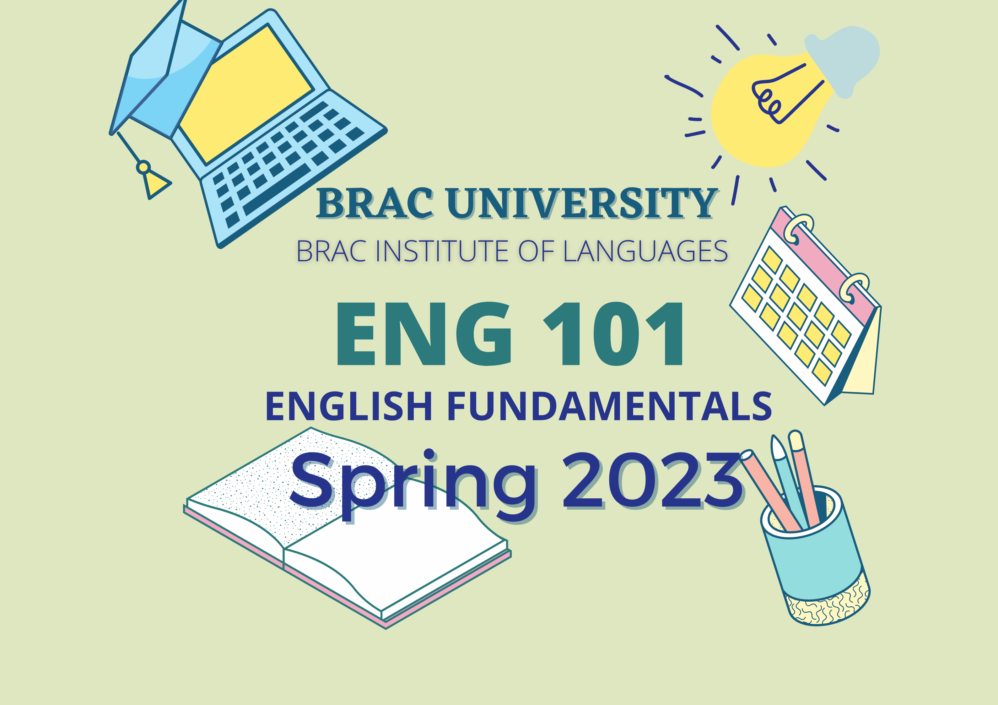 ENG101 is a foundational GenEd course in which students will develop critical thinking, persuasive argument, and study skills through reading, critiquing, and interpreting texts in speaking and writing assignments. The contents will cover the four basic English language skills (reading, writing, speaking, and listening) required for students’ needs, and will teach students in the sequential steps of the writing process, from pre-writing strategies to planning/outlining to writing and revision. Through course elements such as (1) weekly writing and reading, (2) formal essay assignments, (3) clear assessment criteria, and (4) personalized feedback, students will build fluency, confidence, and good habits of work and mind. This will help them build a strong foundation for the challenging writing and thinking tasks they will take on during their time at BRAC and beyond.